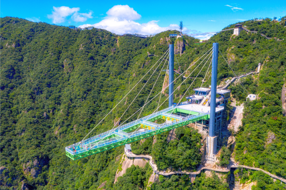 橋身全長82米,全體透明。行走其間如同凌空漫步、踏云破霧,男女老少幾乎人人都可體驗(yàn)的高空玻璃棧橋。